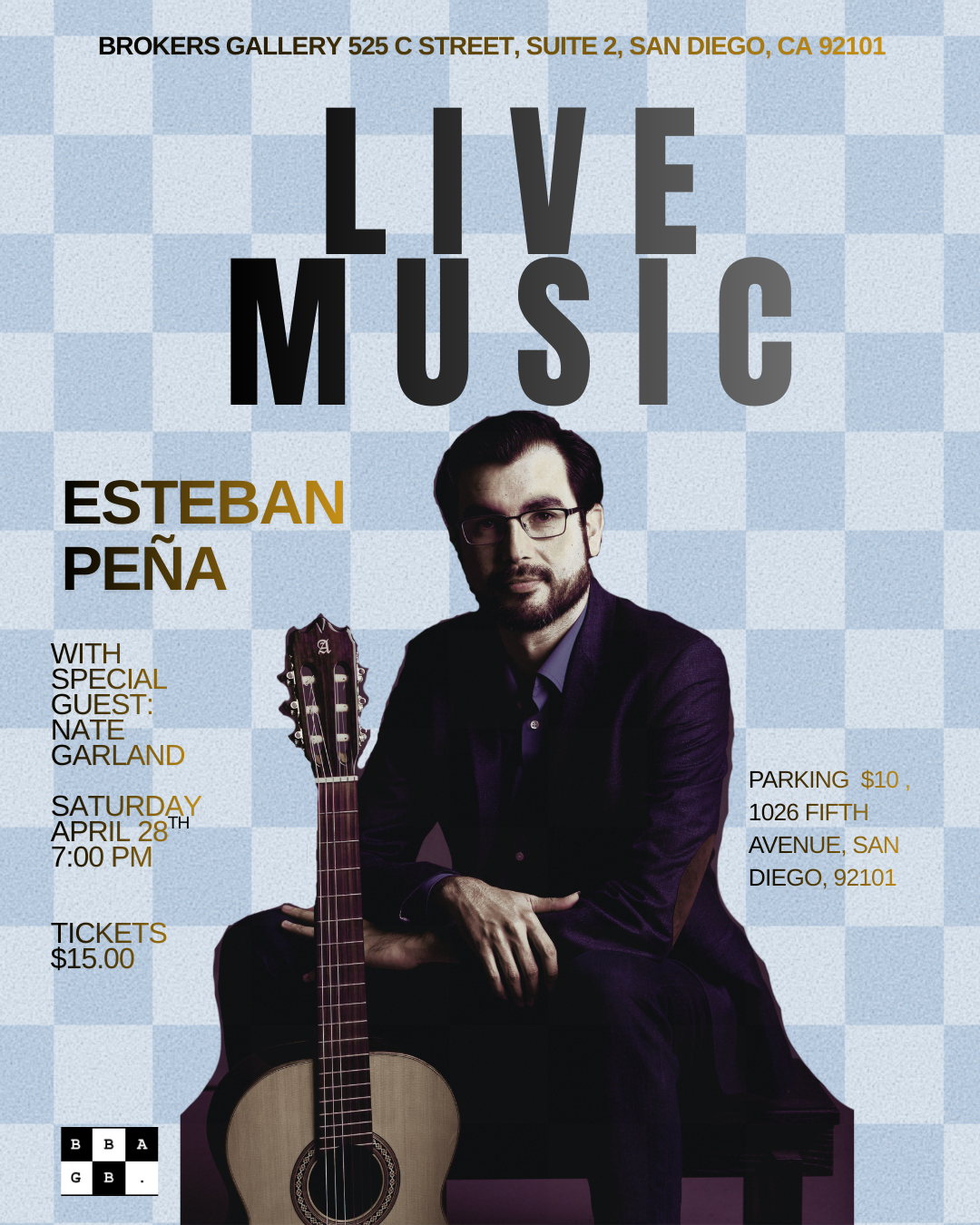 Join us for an intimate night with Esteban Peña telling musical stories through his guitar at Brokers Gallery! This in-person local concert is the perfect chance to enjoy original music to support San Diegan musicians. Spend an evening at Brokers to join the lively and growing community of creatives. Don't miss out on a memorable evening to lift your spirits with fine tunes, with special guest Nate Garland. See you there!